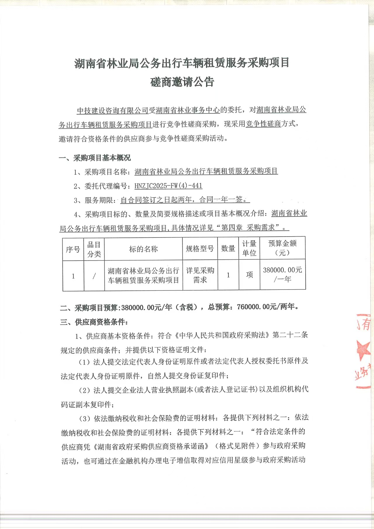 湖南省林業局公務出行車輛租賃服務采購項目磋商邀請公告